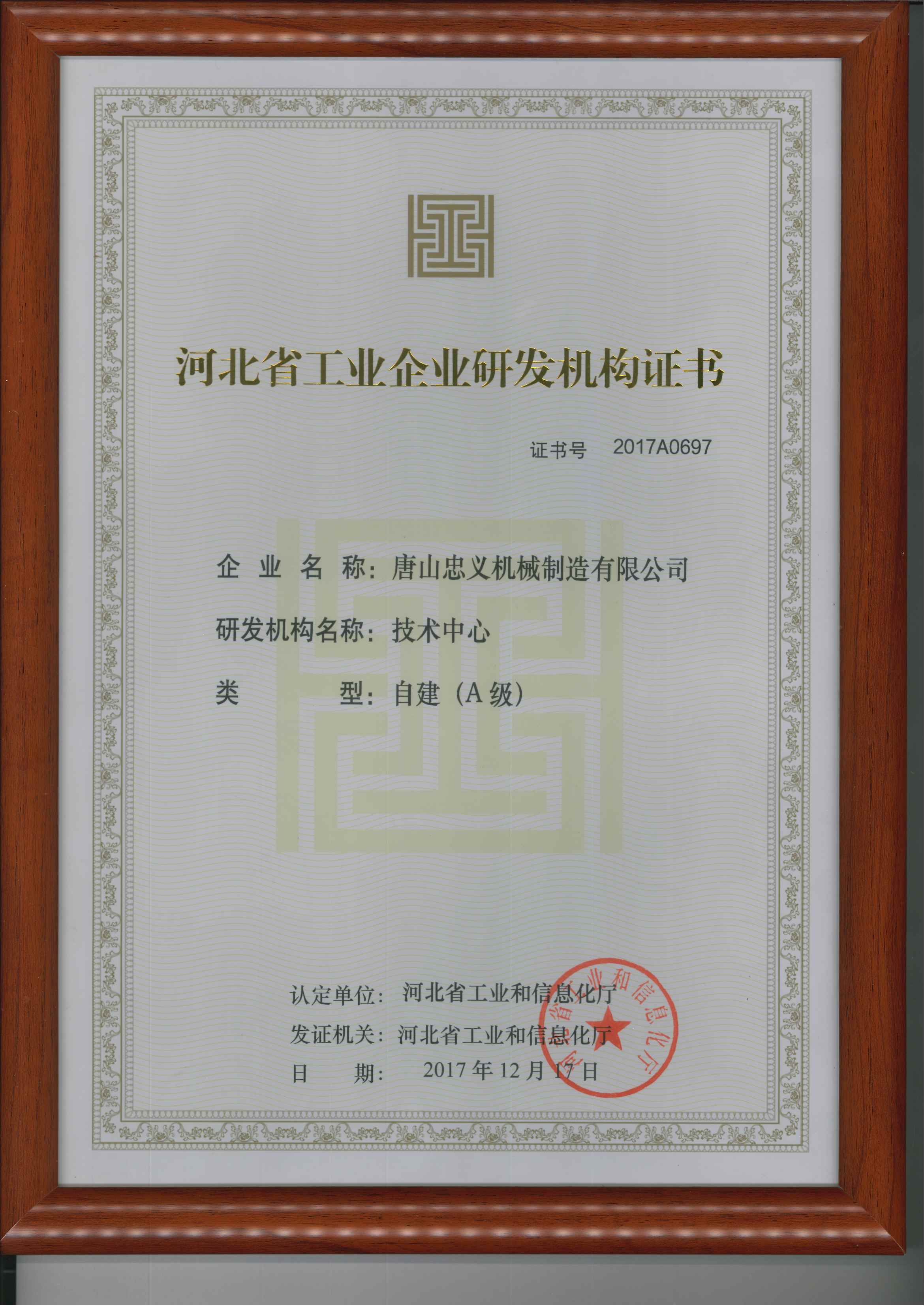 河北省工業(yè)企業(yè)研發(fā)機(jī)構(gòu)證書彩色原版